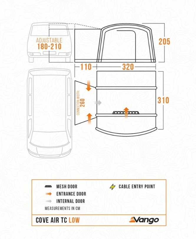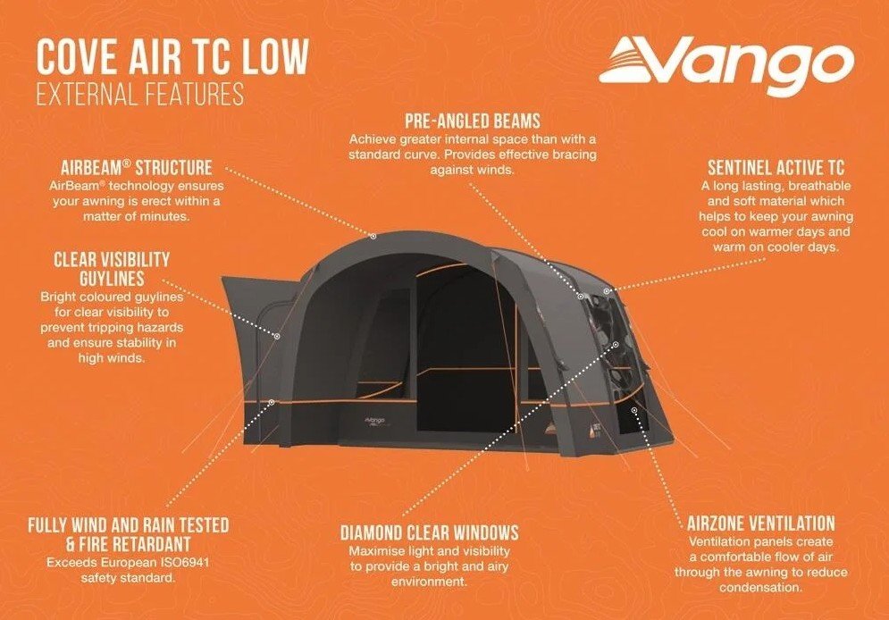 The Vango Cove Air TC Low is the ideal size for ample storage room, socialising or creating an additional sleeping area. The pre-attached front canopy creates a great outdoor seating area to enjoy the views. Utilsing Vango’s AirBeam technology, it is quick and easy to pitch. The soft, breathable Sentinel Active TC fabric keeps your awning cool on warmer days and warm on cooler days.
