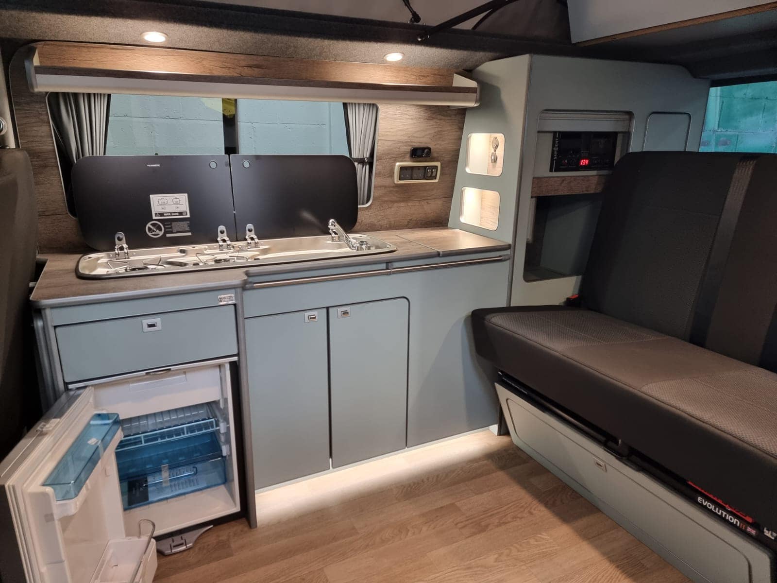 Twin slider vans (particularly the T5/T6) are slightly different internally to a standard single slider van and so we have a specifically adapted twin slider version of our units designed to fit them. We can add access doors to the rear panel of the low kitchen section to allow entry from the extra door and additional table rails can also be fitted to allow al fresco dining.